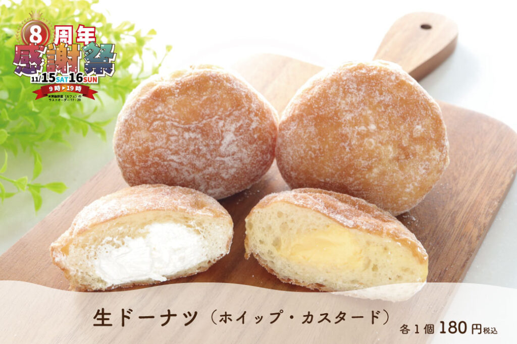 かもめテラスでは、【8周年感謝祭】の限定商品『しっとりドーナツ☆ホイップ・カスタード』を、11月15日・16日の2日間限定で販売します。 しっとりもちもちとしながら、口どけと歯切れのよい食感のドーナツ生地に、それぞれカスタード・ホイップを入れた周年祭限定のドーナツです🍩 🔸『しっとりドー