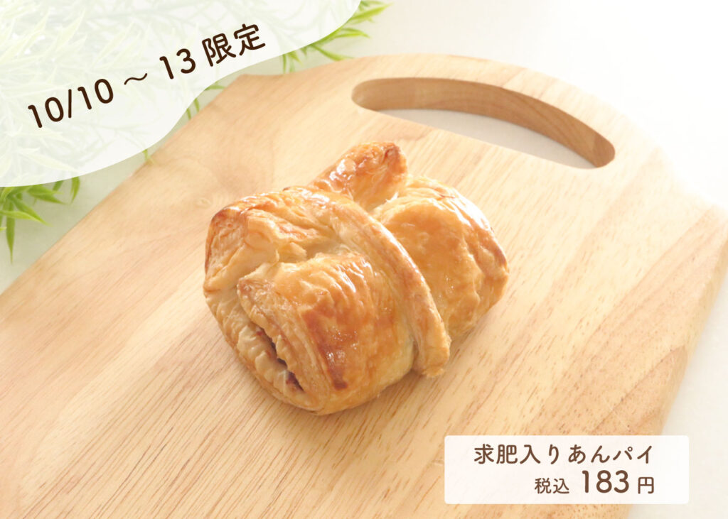 かもめテラスの「パン工房ここあ」では、10月10日~13日限定で『求肥入りあんパイ』を販売します✨ もっちりと柔らかな求肥風フィリングと、コクのあるつぶし餡を、サクサクパイで包み焼き上げました😋 🔸『求肥入りあんパイ』1個 183円(税込) 🔸販売価格 2025年10月10日~13