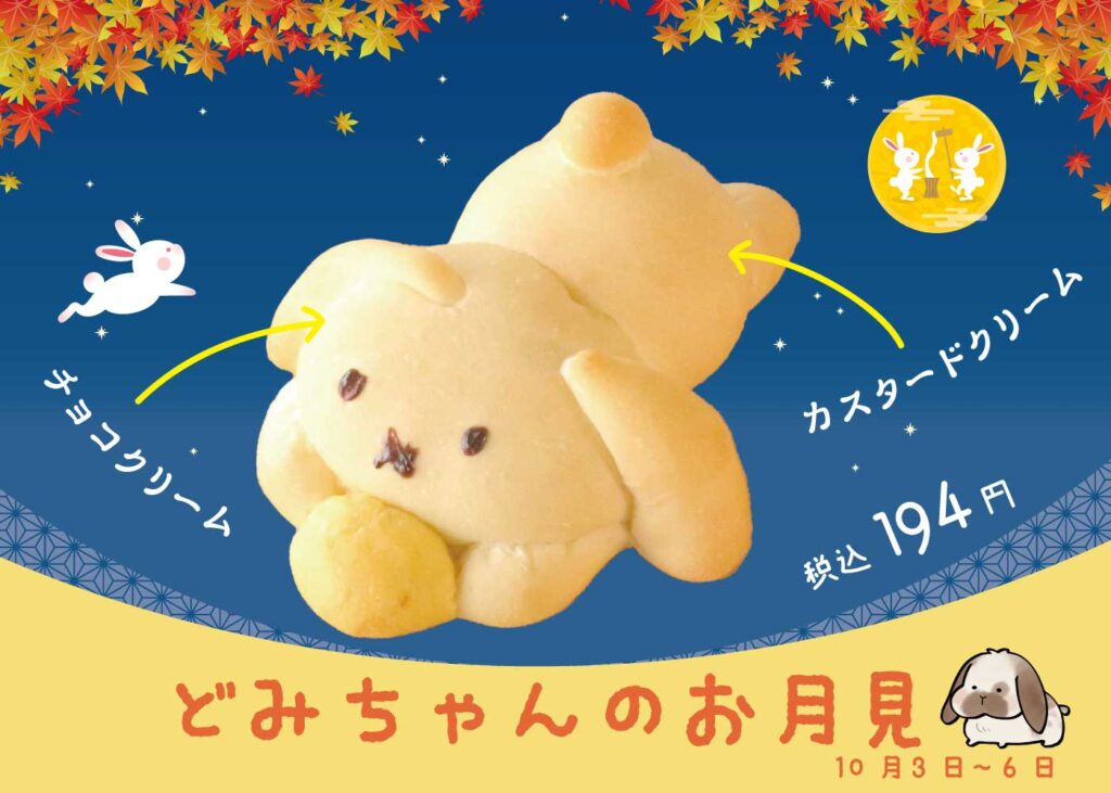 かもめテラスの「パン工房ここあ」では10月3日~6日の4日間、お月見にぴったりな『うさぎのドミちゃんのお月見パン』を期間限定で販売します。 ふんわり生地で顔にはチョコクリーム、胴体にはカスタードクリームを包み、たれ耳のうさぎちゃんにしました。十五夜なのでお月様を持っています。 🔸『うさぎ