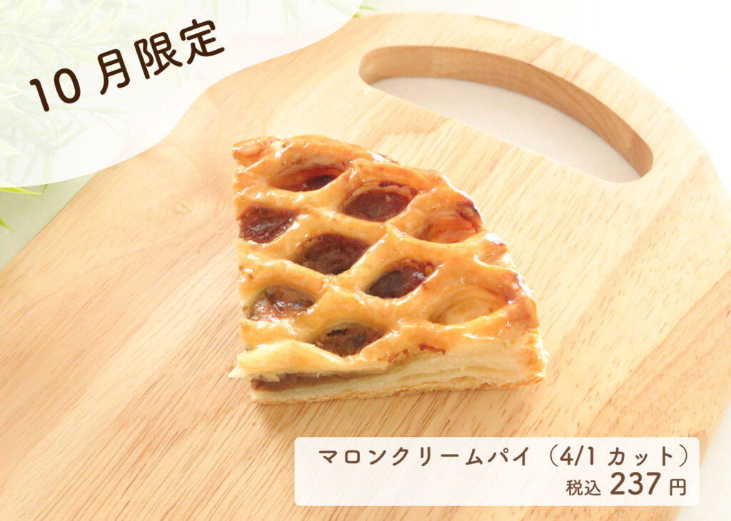 かもめテラスの「パン工房ここあ」では、10月限定で『マロンクリームパイ』を販売します。 サクサクとしたパイ生地に、マロンクリームとマロンケーキフィリング、さらに渋皮栗を乗せたパイです🌰 🔸『マロンクリームパイ』1ピース(1/4カット)237円(税込) 🔸販売期間 2025年10月1