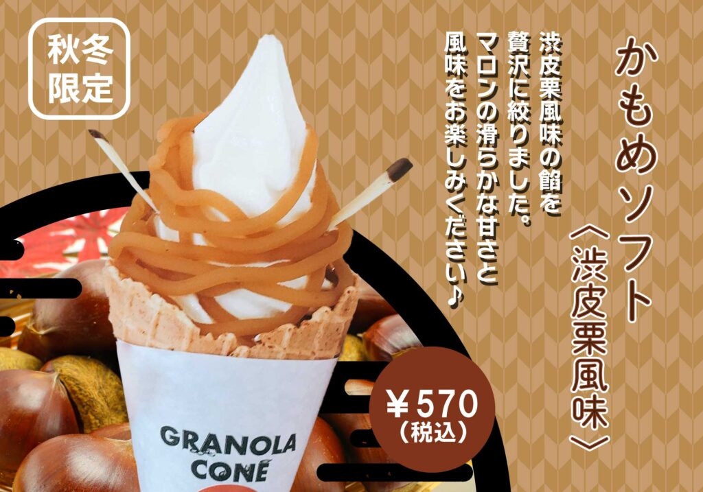 いよいよ栗の季節がやってきました🌰 かもめテラスで人気!「かもめソフト」の秋冬限定バージョン『かもめソフト🌰渋皮栗風味』が好評発売中です✨ 秋冬しか味わえない🌰栗バージョンのかもめソフト、ぜひお試しくださいね😋 「食欲の秋」を楽しむ食べ歩きもおすすめです🍂 かもめテラス周辺には、三
