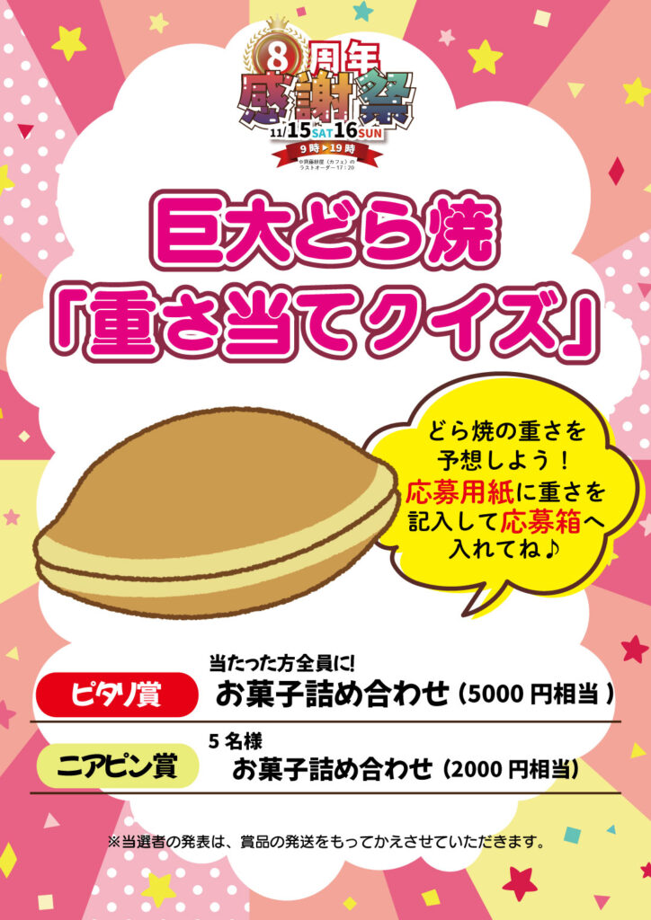 かもめテラスでは、11月15日・16日の2日間『8周年感謝祭』を開催いたします。 直径40㎝の巨大どら焼の『重さ当てクイズ』でピタリ賞をGETしよう!!! 🔸【ピタリ賞】重さを当てたかた全員に!『お菓子詰め合わせ(5,000円相当)』 🔹【ニアピン賞】 5名様! 『お菓子詰め合わせ