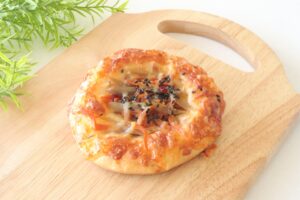 ソフトな生地に、肉そぼろとごぼう入りのフィリングを乗せ、きんぴらごぼうを乗せて焼き上げました。