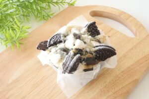 ふんわりくちどけの良いチョコ風味の生地でバニラクリームを巻き込みました。ホイロ後にチョコチップトッピングを絞り、バニラクリームをはさんだココア風味のクッキーをさして焼成しました。