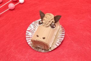 ショコラホイップと洋梨をココアスポンジでロール状に巻き、お馬さんの顔に仕上げました🐎✨