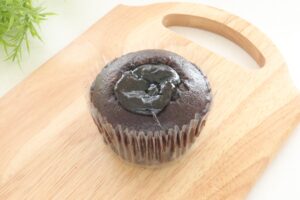 ブラックココアを練り込んだしっとりとした生地でチョコクリームを包み込み、さらに上にもチョコクリームをトッピングしました。