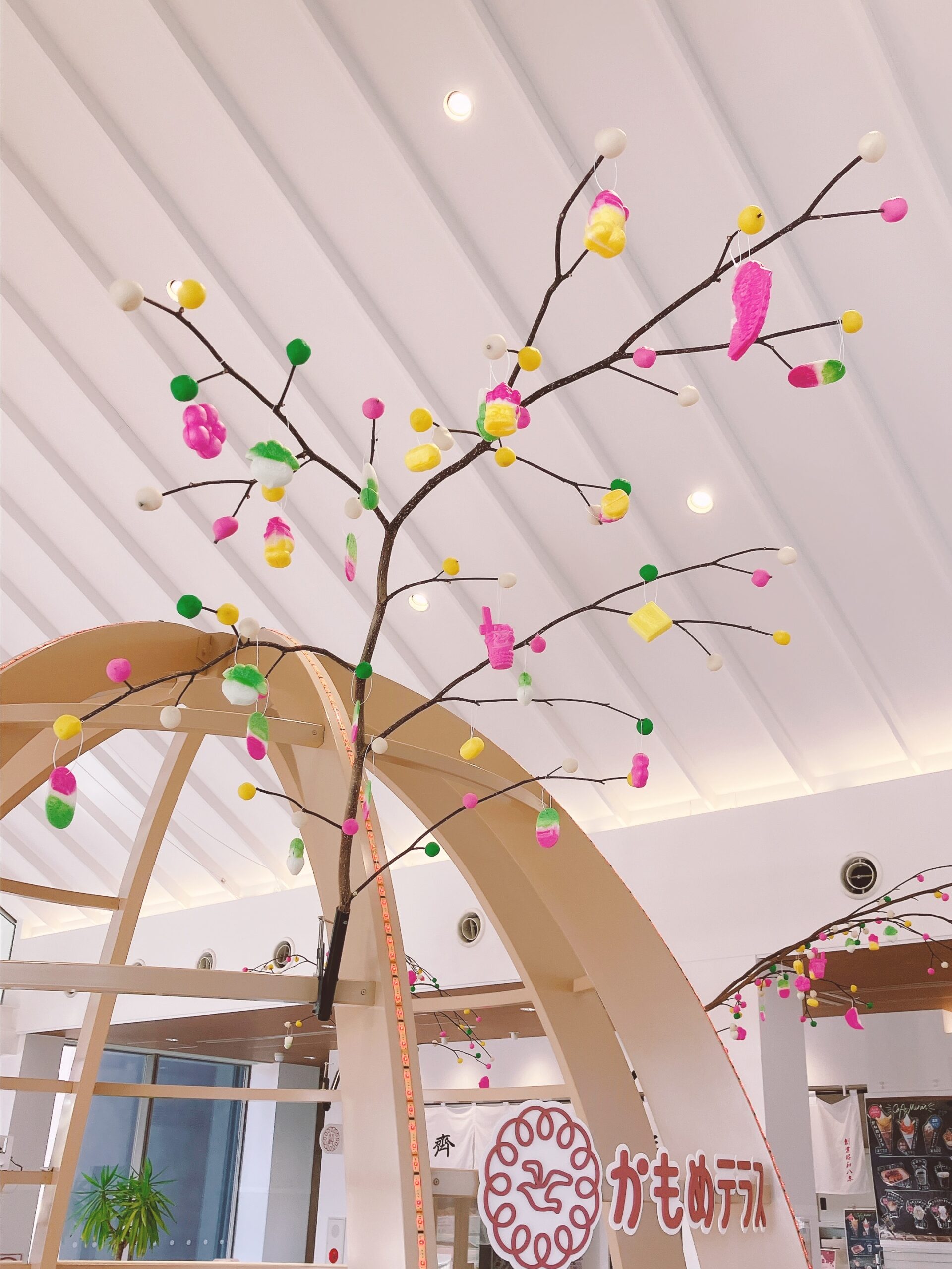 かもめテラスでは、一年の五穀豊穣を願い、ミズキの枝に色とりどりの団子を飾りつける小正月の伝統行事『ミズキ団子』を飾りました😊