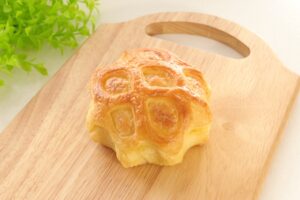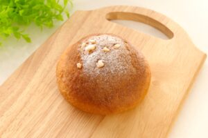 ふんわりと歯切れのよい生地に、コクのあるカスタードクリームとカラメルフィリングを包み、ほろ苦いカラメルソース入りのトッピングをのせました。プリンのような味わいが楽しめる、デザート感覚のパンです。