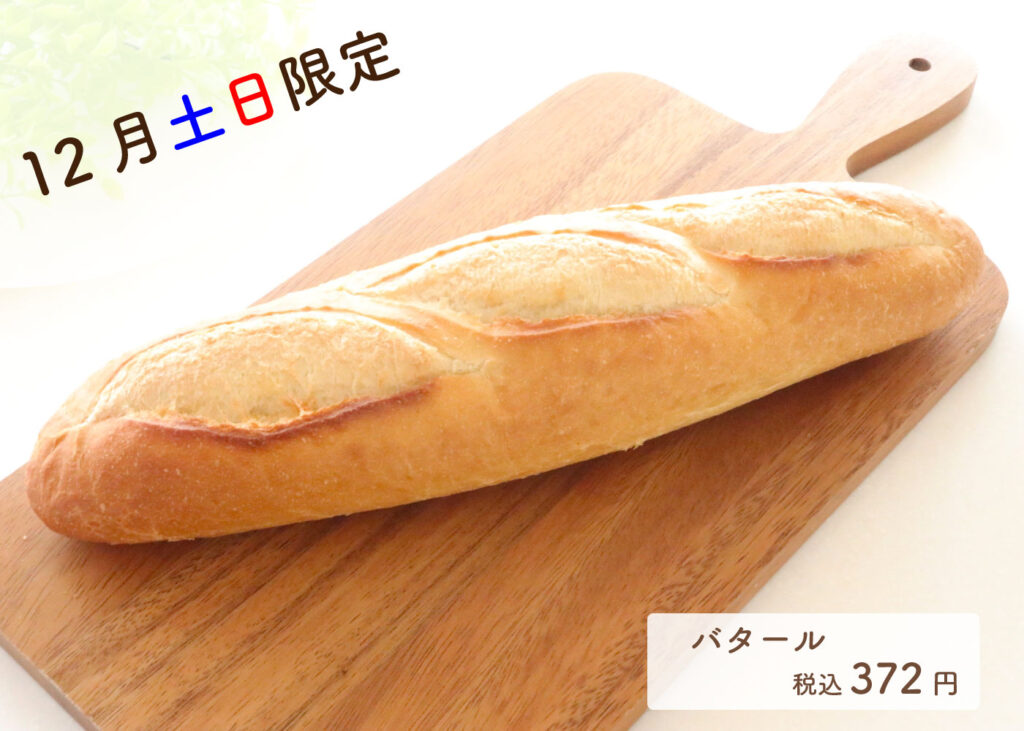 かもめテラスの「パン工房ここあ」では、12月の土曜日・日曜日限定で『バタールパン』を販売します🥖 🔸『バタール』 1個 372円(税込) もっちりとした食感と本格的なフランスパンの風味を感じられます。 トースターで軽く焼くと、外はパリッと香ばしく、中はもっちりと、さらに美味しくお召し上がりい