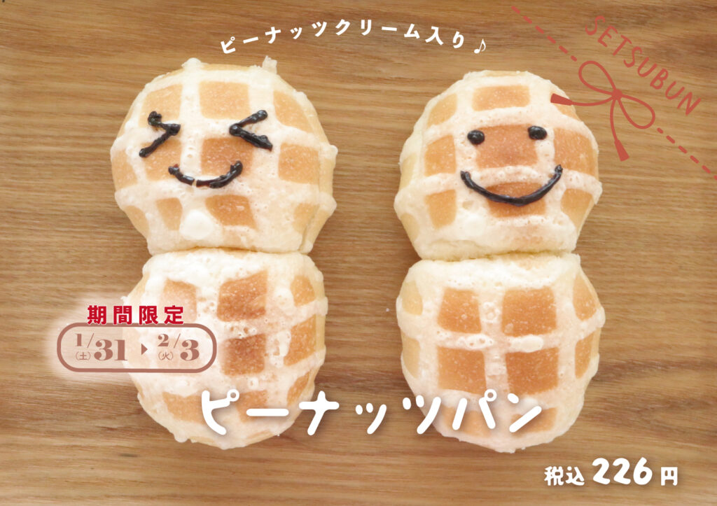 2月3日は節分ですね👹 節分と言えば豆まきですね🥜 かもめテラスの「パン工房ここあ」では、節分の豆まきをイメージした🥜ピーナッツ風のパンを限定販売!!! かわいいピーナッツの形をしたふんわり生地に、香ばしい粒々のピーナッツクリームをサンドしました👹🥰 🔸『ふんわり🥜ピーナッ