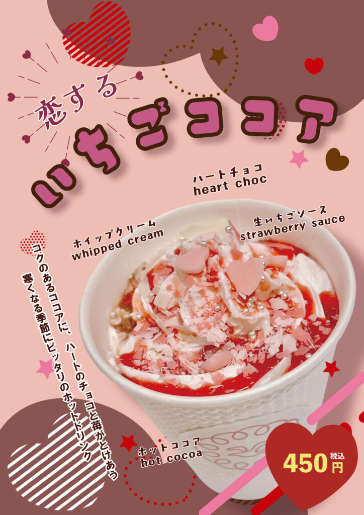 かもめテラスの「斎藤餅屋カフェコーナー」では、期間限定で『恋するいちごココア』を販売中です✨🍓 コクのあるココアに、苺がとけあう冬にぴったりのホットココアです😋 🔸『恋するいちごココア』価格 450円(税込) 🔸冬季限定販売 【三陸 岩手 大船渡 岩手名物 かもめの玉子のさい